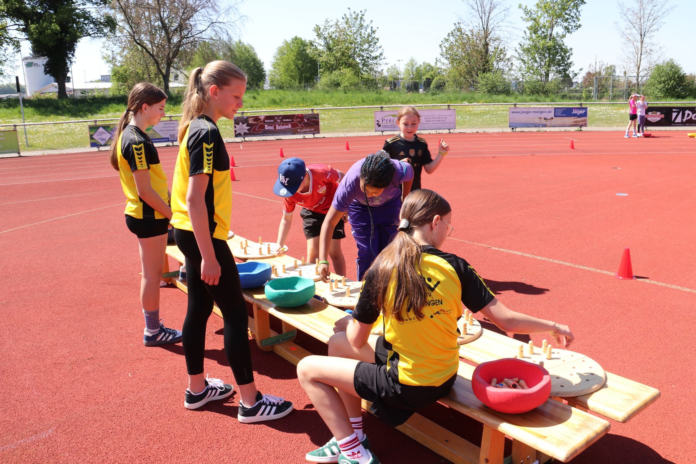 Bei strahlendem Sonnenschein wurde eine nach der anderen Station von den 13 Klassen durchlaufen und nicht nur einmal bekamen die Lehrkräfte, die Helfer:innen und das WLV-Team von den Kindern zu hören, dass die Stationen richtig viel Spaß machen. Ein besonderes Highlight für alle war die Weitsprung-Vorführung des TV Mengen. Athlet:innen von der U12 bis zur U20 sprangen um die Wette und wurden dabei lautstark von den Grundschulkindern angefeuert.