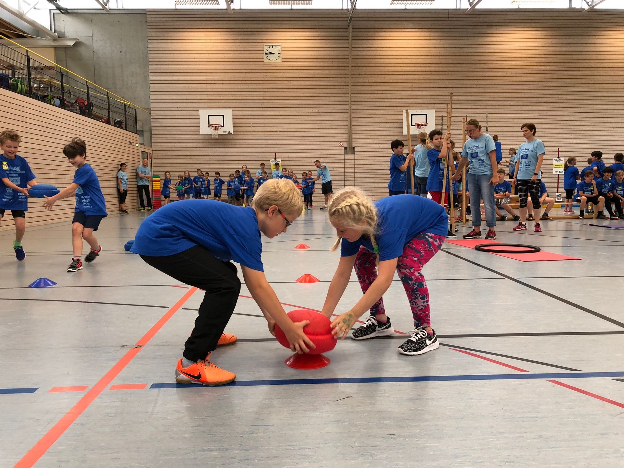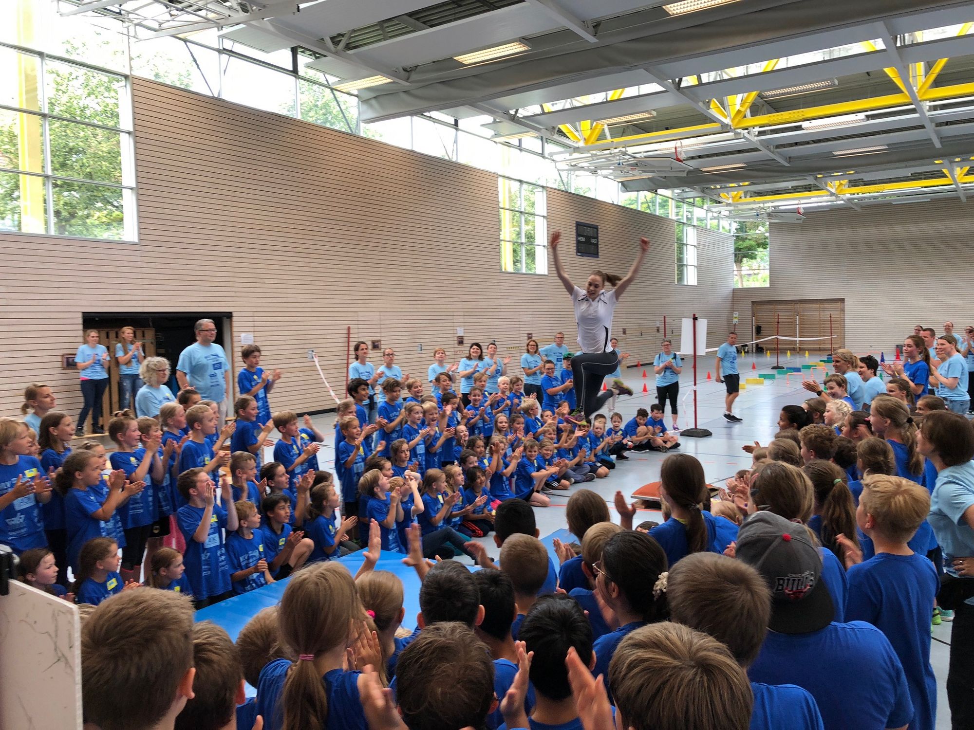 Nach dem optimistischen Aufbau draußen entschied sich das WLV-Team aufgrund von stärker werdendem Regen doch dazu, alle acht Stationen in die Drei-Felder-Halle der Grundschule zu verlegen. Mithilfe der vielen Helfer war der Umzug schnell geschafft, sodass alles bereitstand, als die 200 Kinder der Adolf-Rehn-Schule ankamen.
