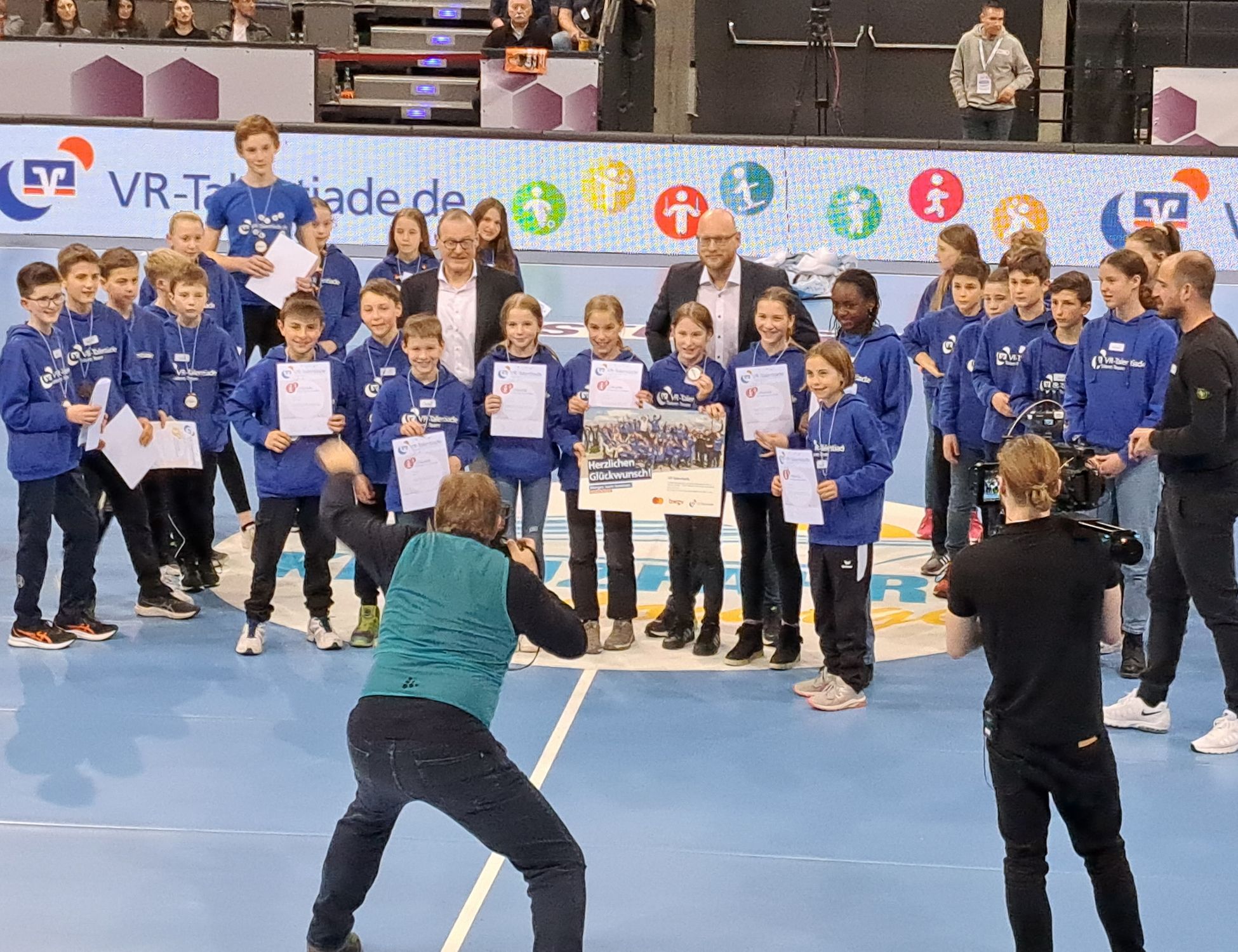 Nach dem Frühstück bekam am Sonntagmorgen jedes Kind einen VR- Talentiade-Hoodie, und dann ging es auch schon wieder weiter in die Sprungbude Bad Cannstatt. Dort konnten wir uns fast zwei Stunden auf allen möglichen Trampolinen oder beim Base Jump austoben. Zum Abschluss fuhren wir zur Porsche-Arena. Im Handball-Final4 der Frauen ging es drunter und drüber. Nach dem ersten Spiel gab es eine besondere Ehrung für uns in der Arena. Dazu durften wir alle auf das Spielfeld und bekamen jede eine Urkunde und eine Medaille. Nach einem mehr oder weniger spannenden Finale, das Bietigheim haushoch gewann, war ein super Wochenende mit vielen neuen Eindrücken und neuen Freunden schon wieder vorbei und wir wurden von unseren Eltern wieder abgeholt.“
