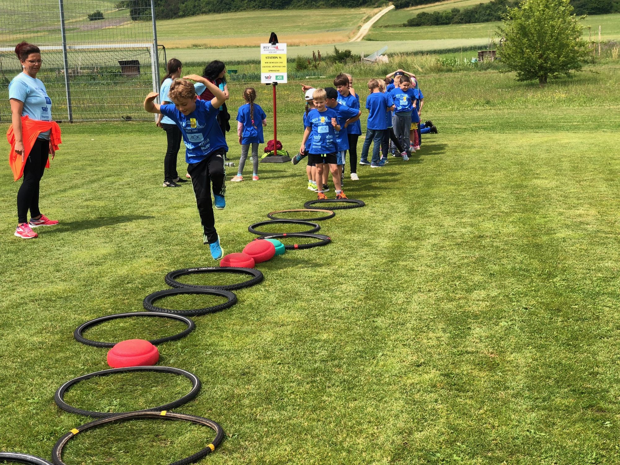 Nachdem alle Helfer und die rund 330 Kinder von der Grundschule Zang, Seebergschule Söhnstetten und Hillerschule mit blauen T-Shirts von der AOK und weiteren Projektsponsoren ausgestattet waren, begrüßte sie Herr Rieberger in seiner Funktion als stellvertretender Bürgermeister. "Heute geht es für euch vor Allem darum, Spaß zu haben!", betonte er. Damit hat er ein Ziel von WLV Kinderleicht-Athletik VOR ORT genau richtig erfasst. Projektleiter und Bildungsreferent des Württembergischen Leichtathletik-Verbandes Rene Stauß erklärt: "Heute wird nichts gestoppt, gemessen oder aufgeschrieben. Die Kinder sollen Spaß an der Leichtathletik finden und neue Bewegungserfahrung sammeln."