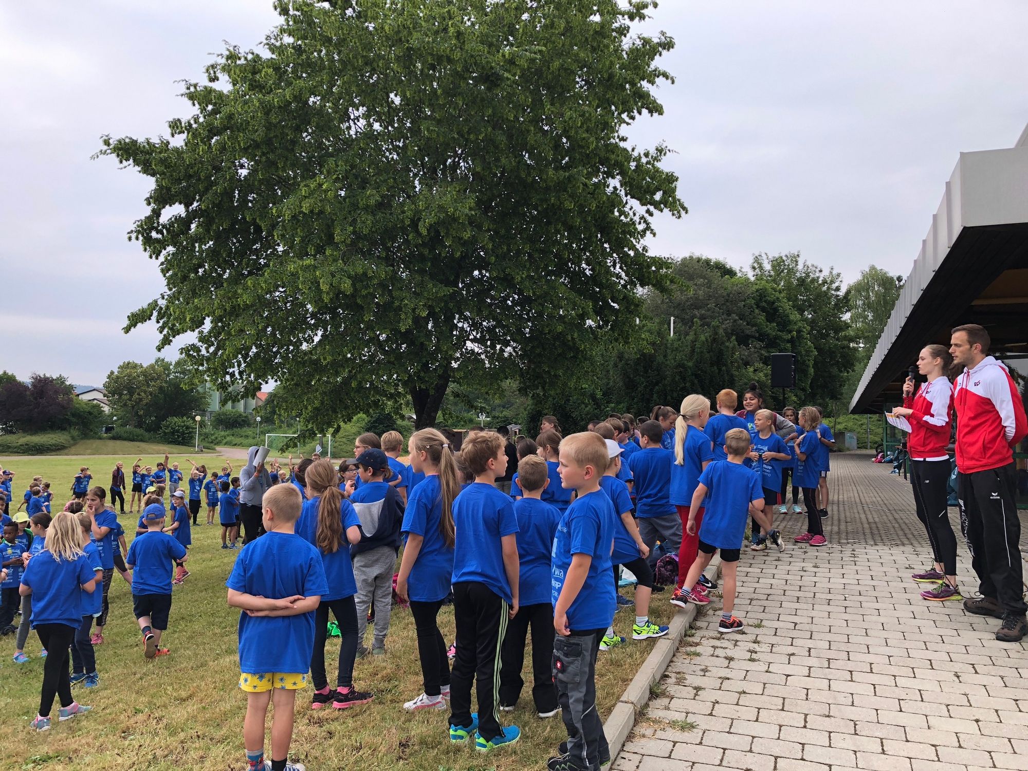 Wie es sich für einen richtigen Sporttag gehört, ging es mit einem gemeinsamen Aufwärmen los. Mit Laufen, Hüpfen, Klatschen und La-Ola-Wellen zu flotter Musik stimmten sich alle auf den bewegungsreichen Tag ein.