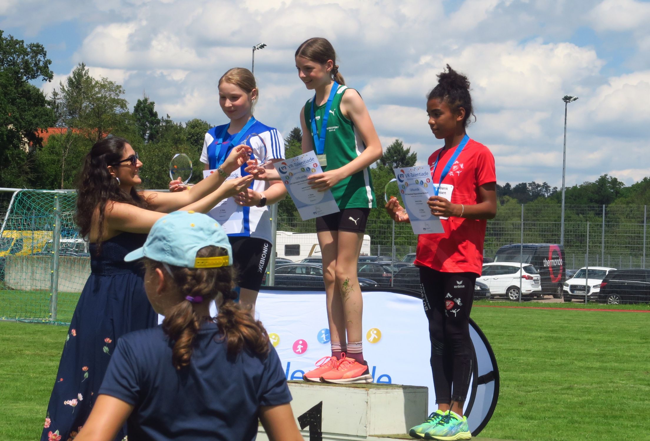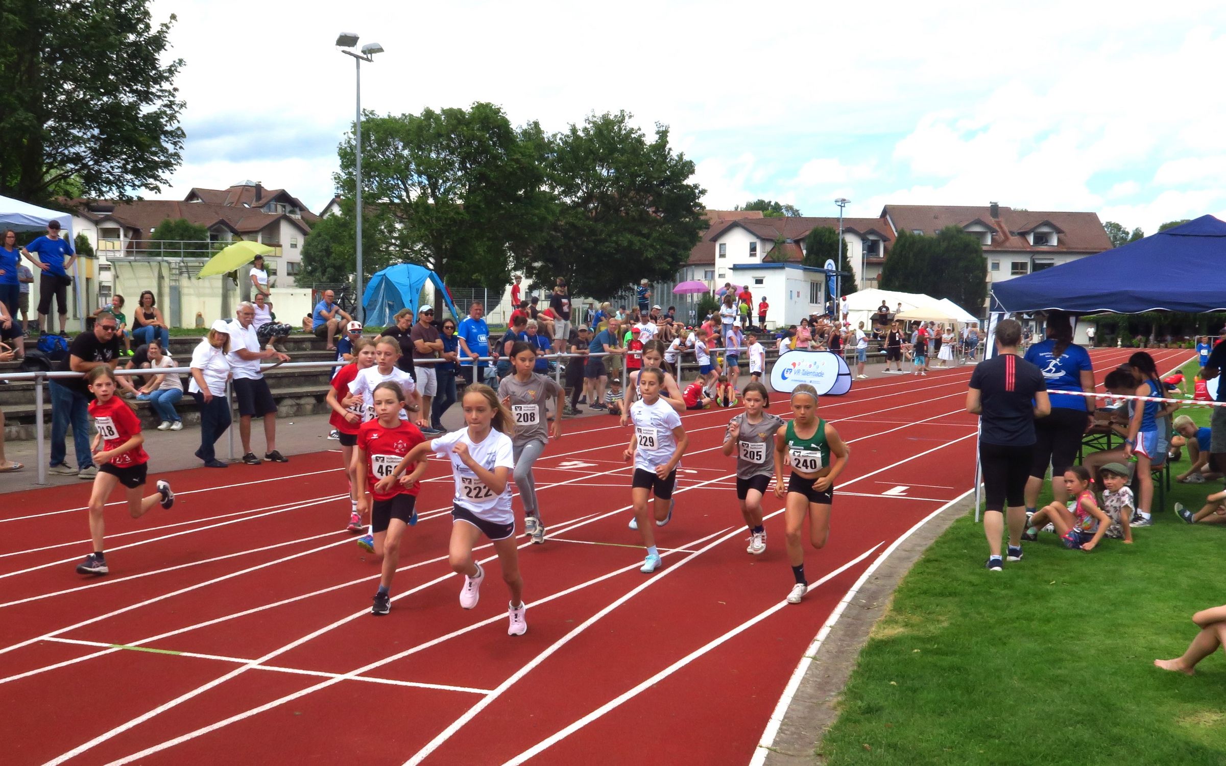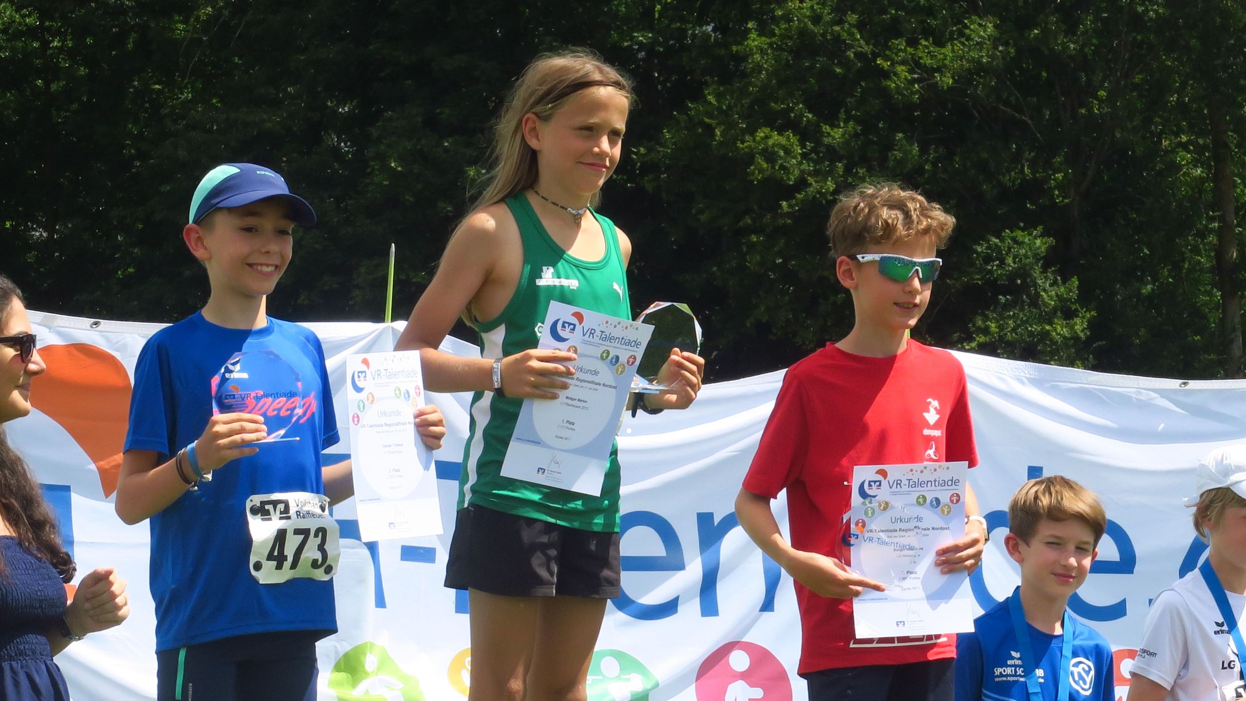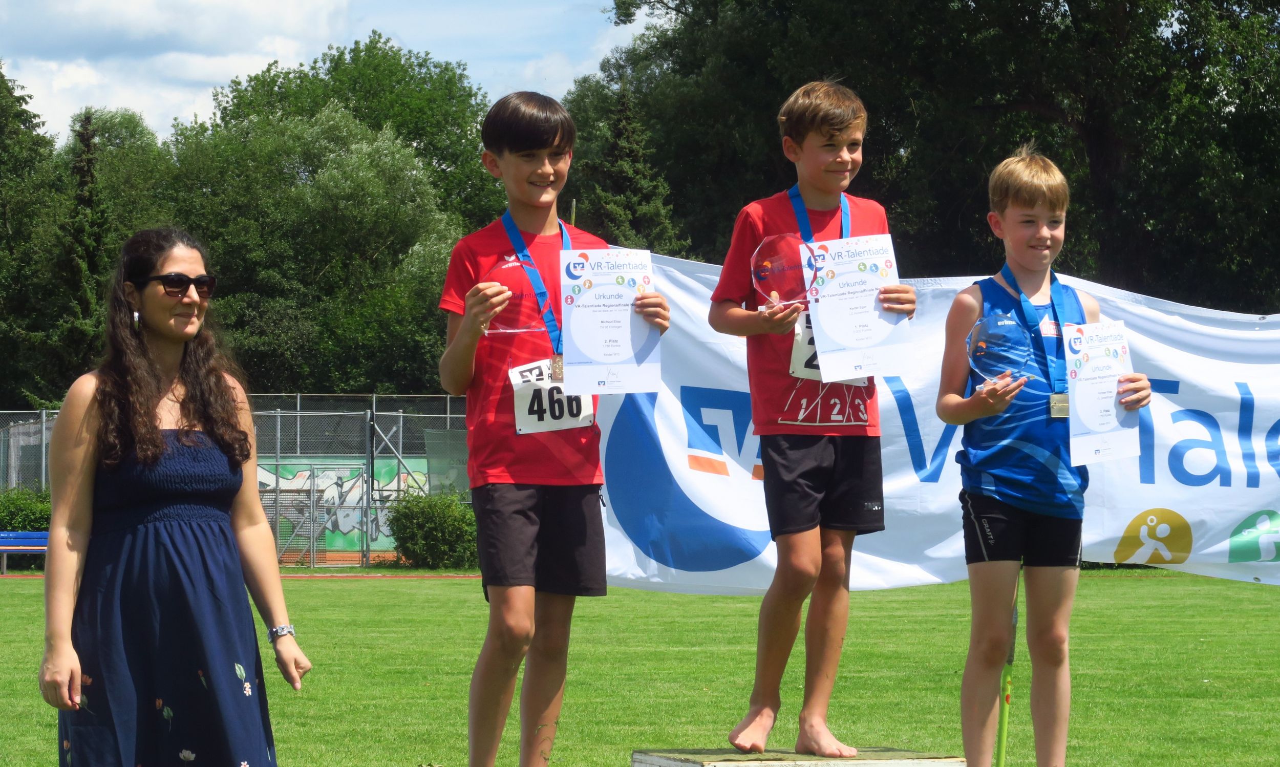 Knapp drei Stunden nach dem Einmarsch konnte Sprecher Markus Fritzsche zur Siegerehrung aufrufen. Aus den Händen von Sevtap Yesilyurt, Regionalmarkleiterin der sponsernden Vereinigten Volksbanken, gab es Urkunden, Medaillen, Siegerpokale und kleine Sachpreise, so dass niemand mit leeren Händen nach Hause fahren musste. Tolle Eindrücke und viele neue Bestleistungen hatten ohnehin schon die meisten im Gepäck. Angenehme sommerliche Temperaturen – im Vergleich zur Hitzeschlacht im Vorjahr in Pliezhausen – und eine reibungslose Organisation machten das Ganze für die 90 Kinder und deren Eltern und Betreuer zu einer runden Sache, für die viele Anreisewege bis zu 90 Minuten auf sich genommen hatten. 18 Vereine hatten im Vorfeld ihre Ergebnisse für eine Teilnahmeberechtigung am Finale eingereicht. Im nächsten Jahr dürfen es gerne noch mehr sein.